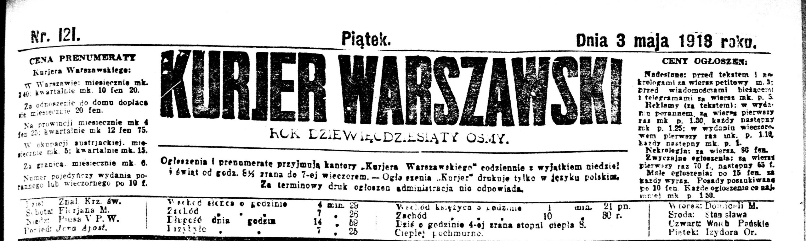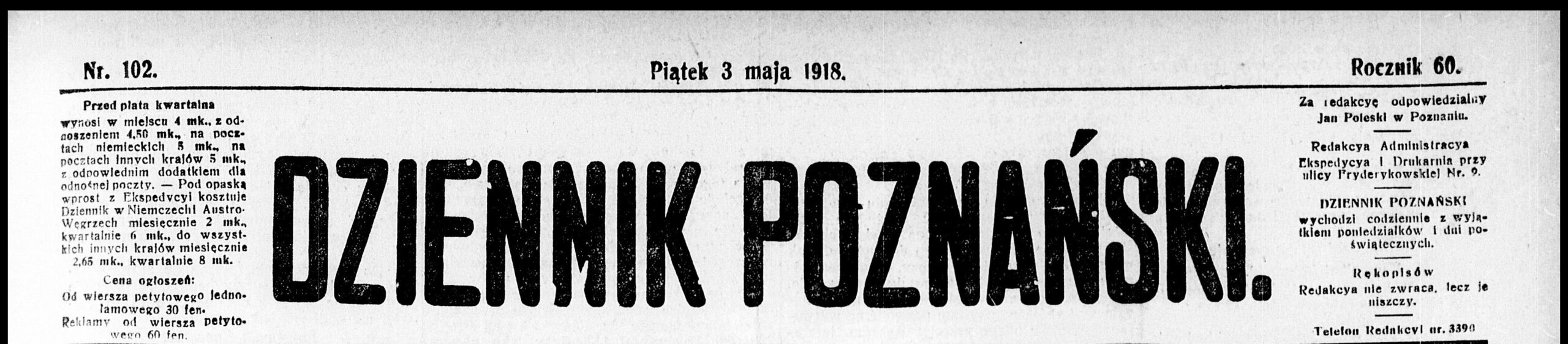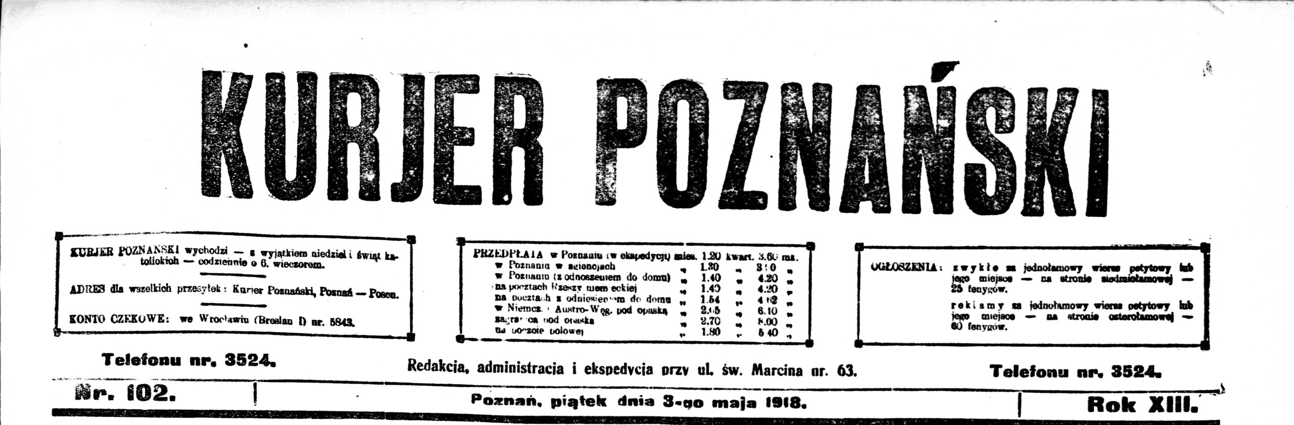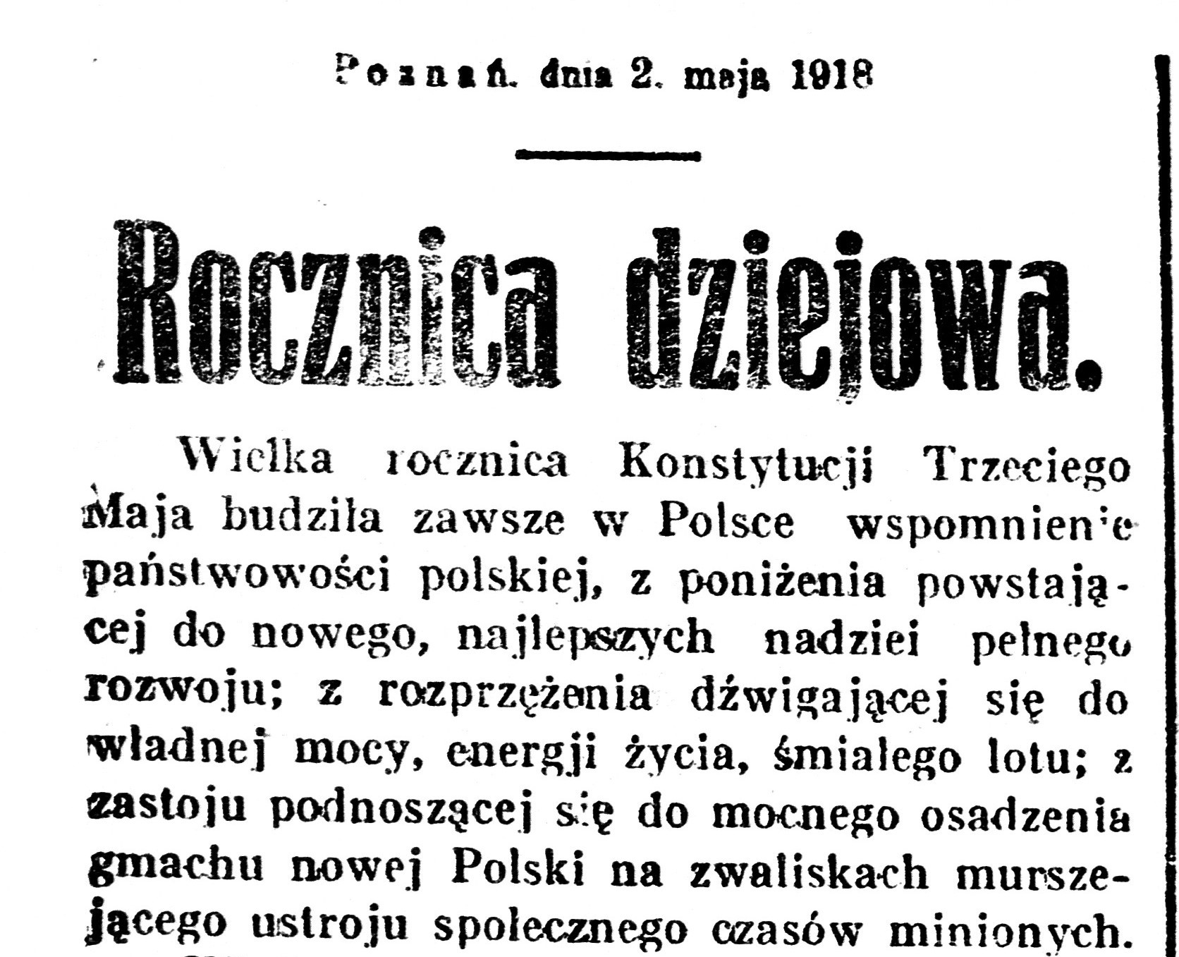 Nie dziwi zatem nikogo, że na pierwszej stronie „Kurjera Poznańskiego” z 3 maja 1918 roku znaleźć można obszerny artykuł poświęcony Konstytucji 3 maja. Początkowo konserwatywne czasopismo, przez jakiś czas znajdujące się w rękach liberalnych ziemian, w 1906 r. stało się organem Narodowej Demokracji.