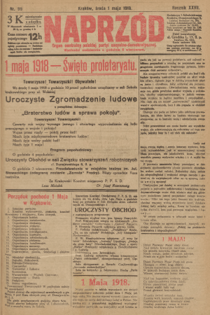 Proletariacki „Naprzód” z majowych świąt wybierał pierwszy dzień tego miesiąca. Czcił go pieśnią i obrazem, zachęcał do czynu, poświęcając robotniczemu świętu nie tylko pierwszą stronę, ale niemal cały numer, nie szczędząc przy tym czerwonej farby drukarskiej w nagłówku i tytułach artykułów, co nie było jego praktyką codzienną.