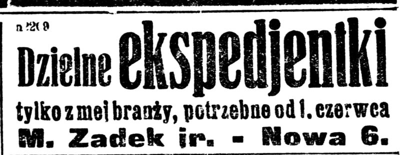 Komu zaś brakowało środków na marchew z powodu nie dość dobrze płatnej posady, rozważyć mógł skorzystanie z poniższej propozycji pracy. Szczególnie intrygujący wydaje się tutaj charakter zajęć, które przewidywać może oferta skierowana do „dzielnych ekspedientek”. Przedsiębiorca o wdzięcznym nazwisku Zadek musiał być nad wyraz dobrze znany w Poznaniu, skoro nie poczuwał się do objaśnienia, jakaż to branża wymaga od sprzedawczyni niepospolitej dzielności.