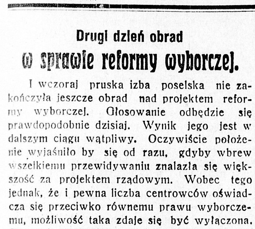 Rząd pruski stoi niezłomnie na gruncie równego prawa wyborczego. Poza tem jednak gotów jest do obszernych ustępstw, mających rzekomo zabezpieczyć życie państwowe przed nadmierną radykalizacyą. Ustępstwa te idą tak daleko, że wywołują żywy niepokój, a po części energiczne protesty w obozie lewicy. W każdym razie, wszystko zdaje się przemawiać za tem, że po odrzuceniu równego prawa wyborczego rozpoczną się nowe rokowania pomiędzy rządem a stronnictwami, w których centrum, domagające się , jak wiadomo gwarancyi dla wyznaniowego charakteru szkoły, odgrywać będzie decydującą rolę. Oczywiście rokowania te jedynie wówczas liczyć mogą na powodzenie, jeśli zachowacy zerwą z swą nieprzejednaną postawą i w zamian za ustępstwa na innem polu, zgodzą się na równe prawo wyborcze.