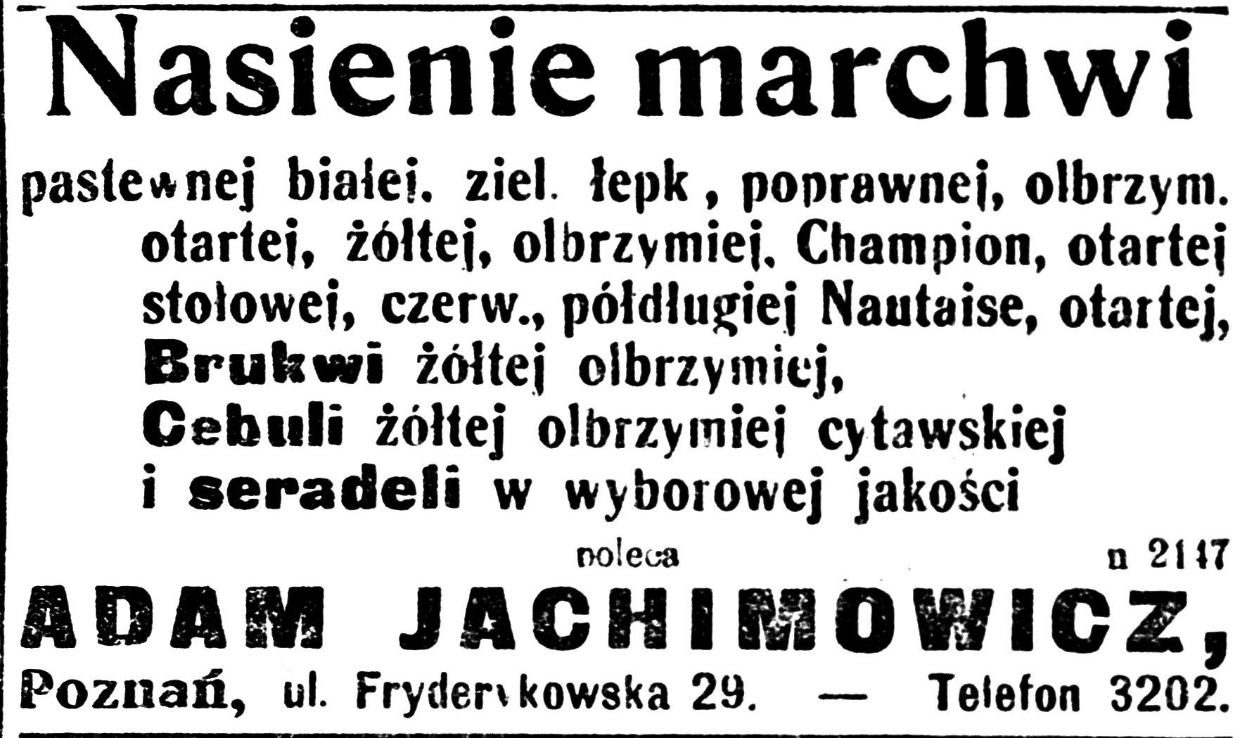 Z tej podróży po gazetach dalekich i bliskich warto na zakończenie powrócić na chwilę do Poznania i zwrócić uwagę na przejaw wielkopolskiego pragmatyzmu. Dla Adama Jachimowicza nie miały znaczenia podziały polityczne, lecz jedynie dobry nośnik reklamy. Tym sposobem zarówno w „Kurjerze”, jak i „Dzienniku Poznańskim” znalazło się zaproszenie do zakupu nasion marchwi najwyższej jakości.