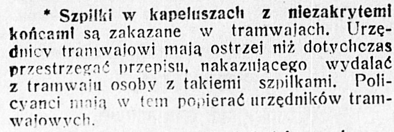 Dzielnym ekspedientkom, proletariuszom, konserwatystom, przedstawicielom endecji, a także wszystkim pozostałym rodakom wybierającym się do Poznania, zwracamy na zakończenie uwagę na mikroskopijną i umieszczoną na jednej z ostatnich stron notatkę z „Dziennika poznańskiego”, której pominięcie mogło narazić na kłopoty z prawem, w przypadku niewłaściwego skorzystania ze środków komunikacji miejskiej. Szczególnie panie powinny mieć się na baczności.