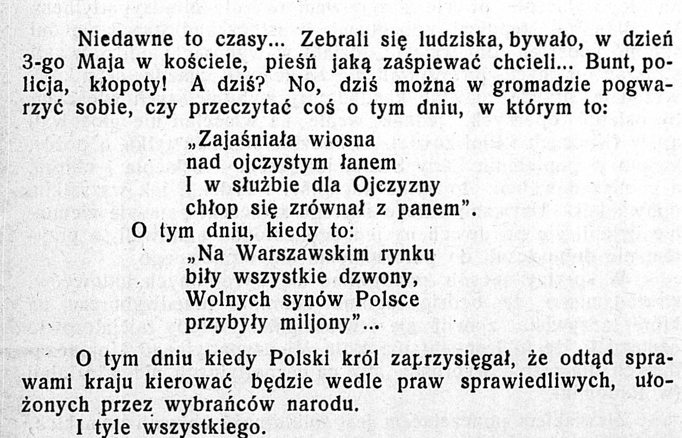 Dobrze to pogwarzyć o jasnych dniach z przeszłości naszej, ale to nie dosyć. Jesteśmy w momencie, kiedy nowe prawo krajowe stanowić sobie mamy. Wszak dopominamy się o zwołanie jaknajrychlejsze sejmu. Pora więc tak myśl swoją przygotować, byśmy zdolni z sejmu onego mieć taki plon, jaki przyniósł Narodowi naszemu sejm, na którym ową Konstytucję 3-go Maja uchwalono.
