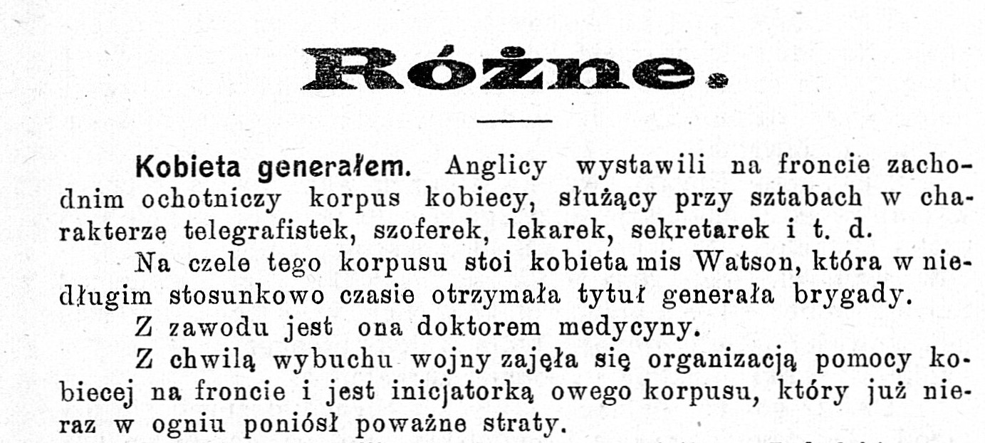 Nawiasem mówiąc, o znaczeniu wolności i równouprawnienia wszystkich stanów „Wyzwolenie” pisało także na jednej z dalszych stron, w krótkiej notce zawartej w dziale z osobliwościami. Za taką to nacechowaną niezwykłością ciekawostkę uznała redakcja informację o militarnych dokonaniach pewnej angielskiej pani doktor, będącej prekursorką sukcesów kobiet w brytyjskiej służbie wojskowej.