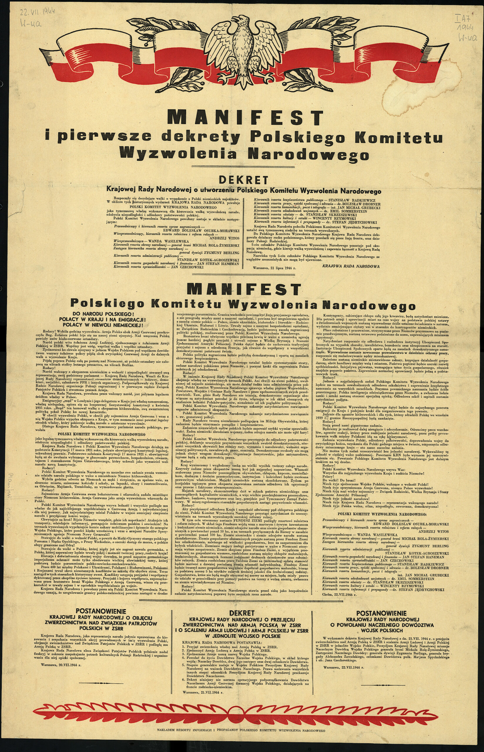 24 sierpnia 1944 roku ukazał się dekret PKWN o wprowadzeniu do obrotu biletu skarbowego z napisem Narodowy Bank Polski i nominowanego w złotych. Podkreślenie tego było częściowo zabiegiem propagandowym, banknoty drukowano bowiem w Moskwie, ich faktycznym emitentem była zaś powołana przez PKWN Centralna Kasa Skarbowa. NBP jeszcze nawet nie istniał. Wprowadzone zostały również kursy wymiany, niczyjej uwagi nie umknęło jednak, że pominięto przy tym reichsmarkę. To spowodowało jeszcze większy niepokój.
