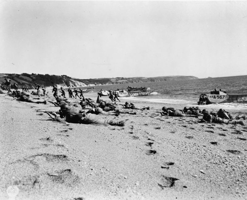 Amerykańscy żołnierze w Anglii ćwiczą lądowanie na plaży, 25 kwietnia 1944 r. (fot. Biblioteka Kongresu USA, digital ID: 2003668297, domena publiczna)