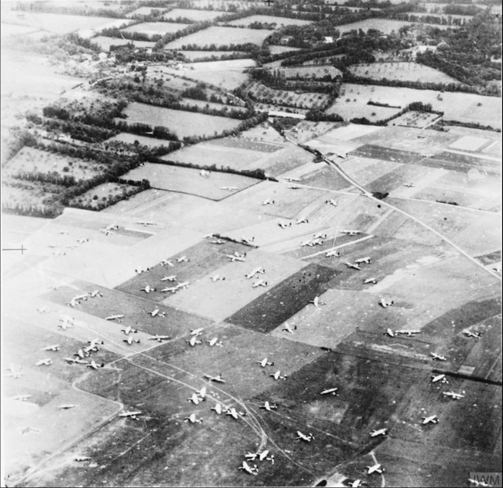 Część 6 Dywizji Powietrzno Desantowej w strefie zrzutu pomiędzy Ranville i Amfreville, widoczne szybowce Airspeed Horsa, 6 czerwca 1944 r. (fot. ze zbiorów Imperial War Museum, nr MH 2076, IWM Non Commercial Licence)