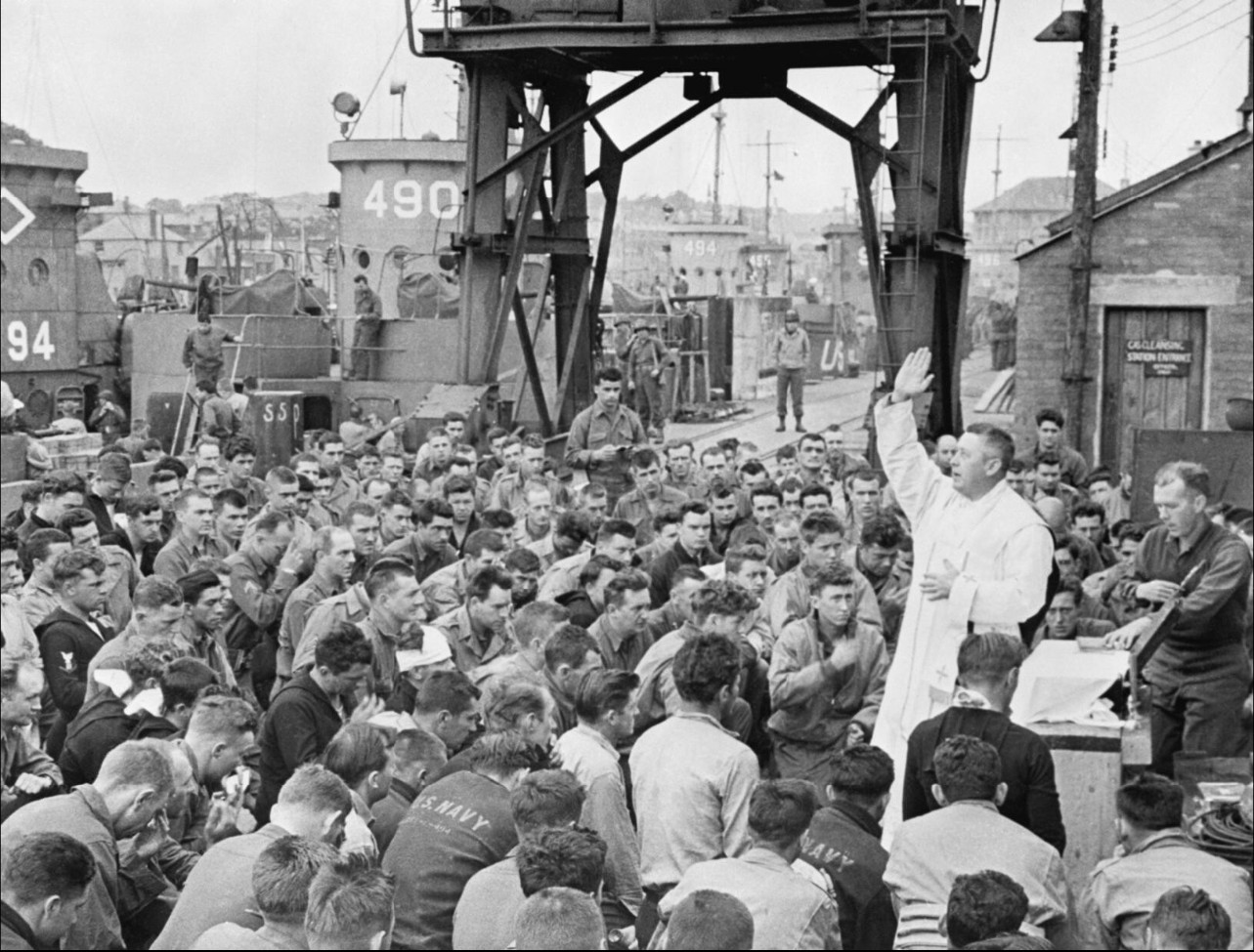 Major Edward J. Waters, katolicki kapelan w armii amerykańskiej, odprawia nabożeństwo dla marynarzy mających wypłynąć w kierunku plaży Omaha, czerwiec 1944 r. (fot. ze zbiorów Imperial War Museum, nr EA 25518, domena publiczna)