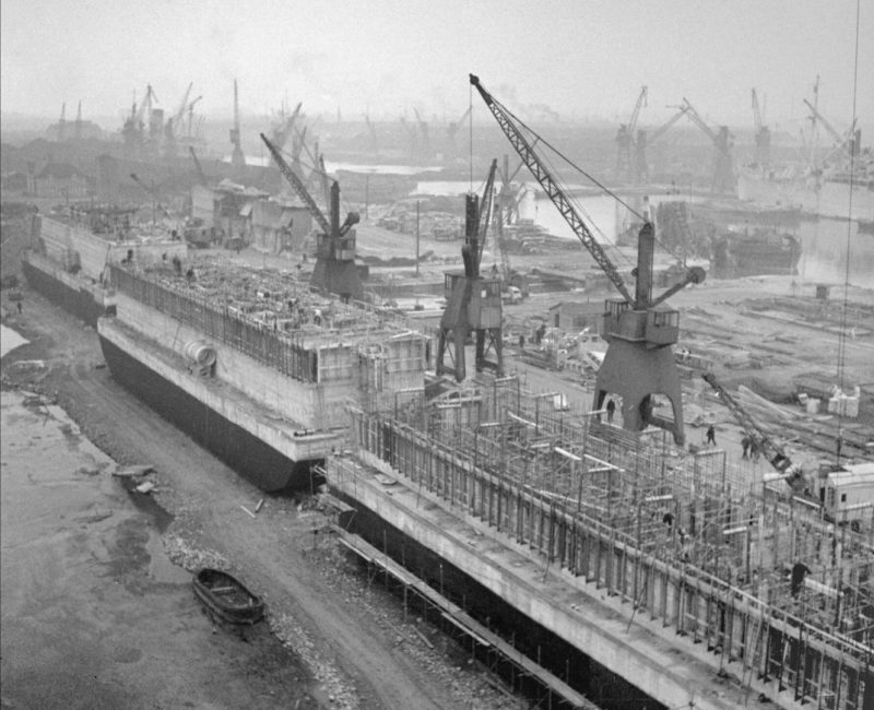 Budowa sztucznych nabrzeży Mulberry, Surrey Docks w Rotherhithe, Londyn, 17 kwietnia 1944 r. (fot. ze zbiorów Imperial War Museum, nr H 37607, domena publiczna)