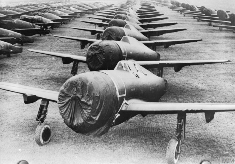 Amerykańskie myśliwce P-47 Thunderbolt (w środku) i P-51 Mustang w Anglii, kwiecień 1944 r. (fot. ze zbiorów Imperial War Museum, nr NYT 20041, domena publiczna)