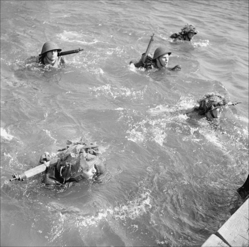 Brytyjscy żołnierze uczą się pływania w pełnym rynsztunku, 2 maja 1944 r. (fot. A.C.D. Laing, ze zbiorów Imperial War Museum, nr H 38125, IWM Non Commercial Licence)