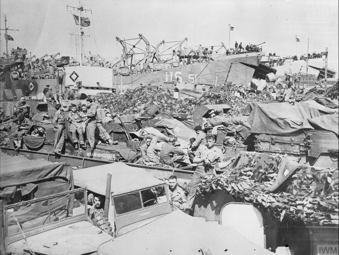 Amerykańscy żołnierze i ich sprzęt na zatłoczonym okręcie desantowym, czerwiec 1944 r. (fot. ze zbiorów Imperial War Museum, nr EA 25974, domena publiczna)