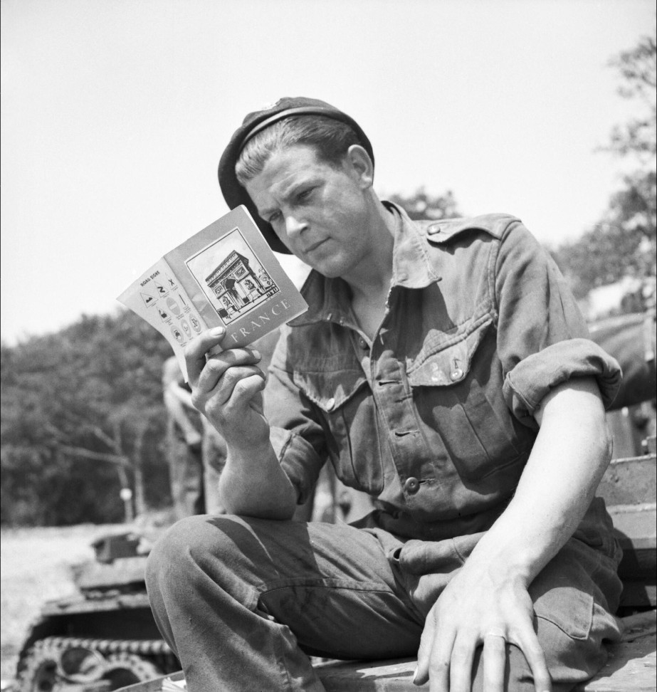 Brytyjski żołnierz czyta broszurę z podstawowymi informacjami o Francji, 29 maja 1944 r. (fot. J.L. Evans, ze zbiorów Imperial War Museum, nr H 38831, IWM Non Commercial Licence)