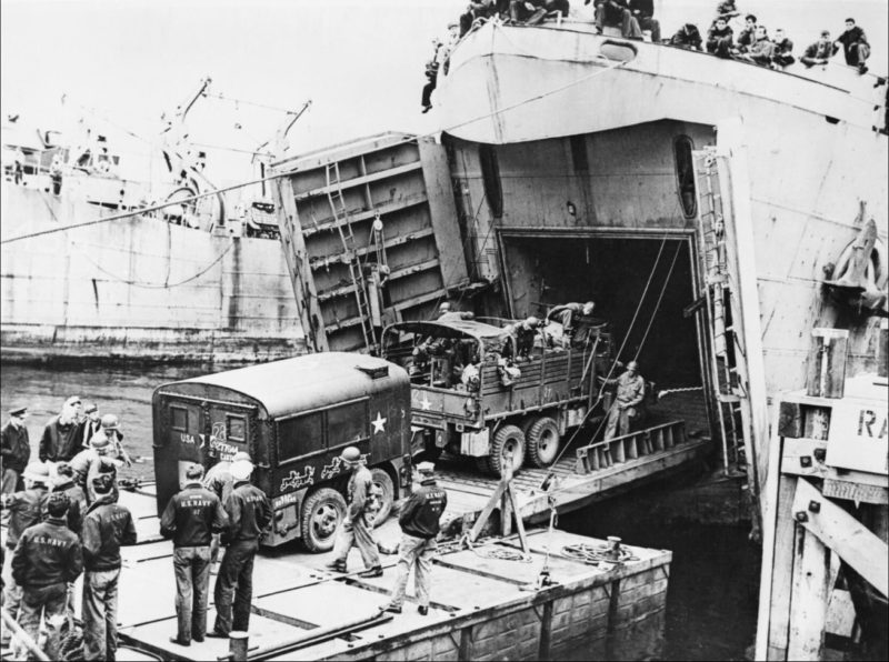 Amerykańska ciężarówka wciąga kuchnię polową na pokład okrętu desantowego, czerwiec 1944 r. (fot. ze zbiorów Imperial War Museum, nr EN 25387, domena publiczna)