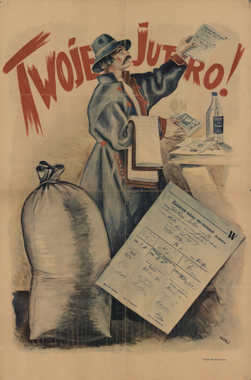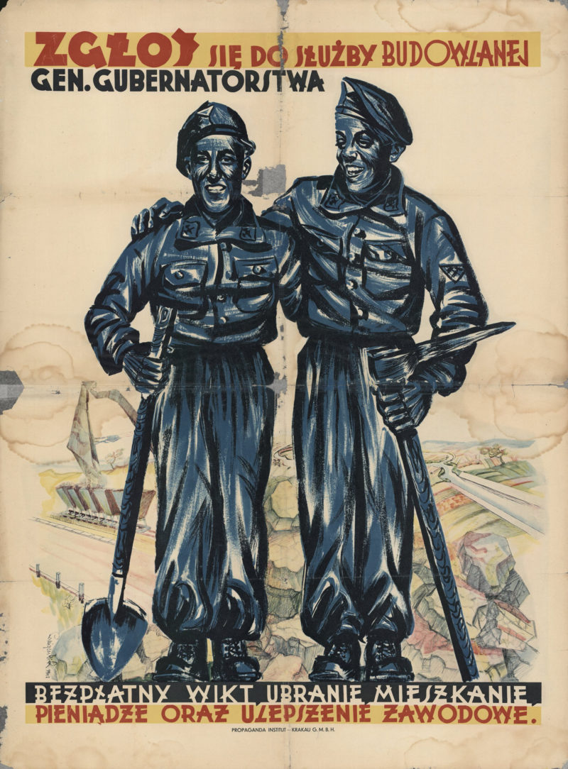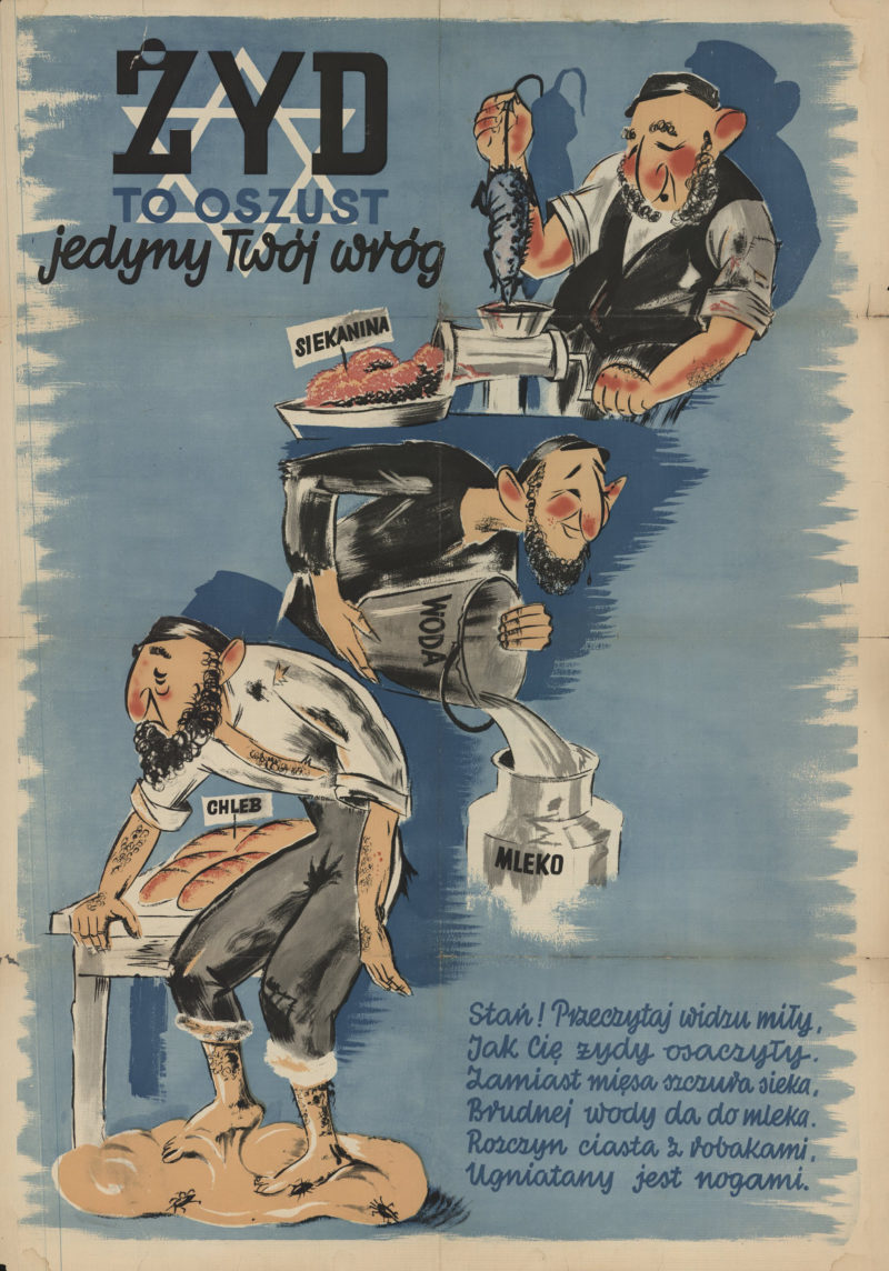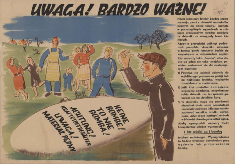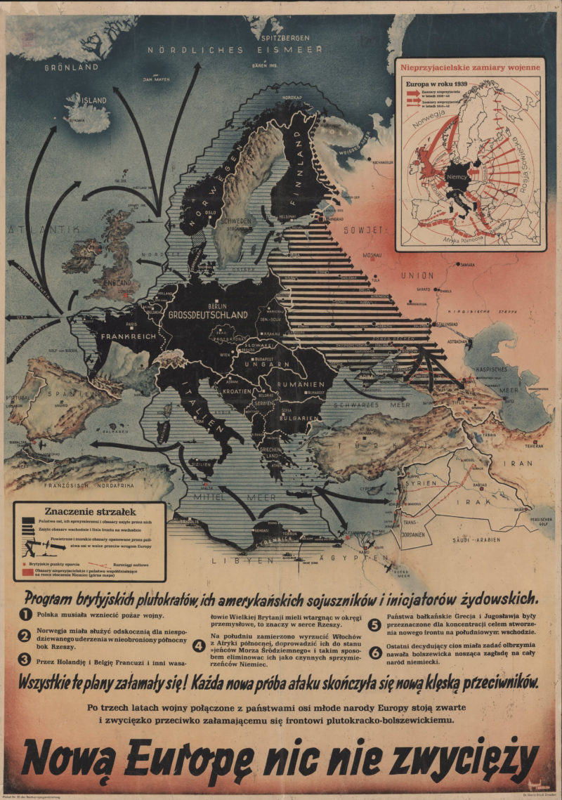 Churchillowski znak zwycięstwa oznaczać miał z kolei tryumf Wehrmachtu… (ze zbiorów Archiwum Akt Nowych, sygn. 2/1335/0/23/195/22, domena publiczna)…w końcu „Nową Europę nic nie zwycięży” [sic!] (ze zbiorów Archiwum Akt Nowych, sygn. 2/1335/0/23/195/13, domena publiczna)Zwycięstwo „demokratów” po prostu nie było możliwe (ulotka ze zbiorów Archiwum Akt Nowych, sygn. 2/1335/0/23/194/108, domena publiczna)Zawsze jednak można było się pośmiać (ze zbiorów Archiwum Akt Nowych, sygn. 2/1335/0/23/195/24, domena publiczna)Czym tu się zresztą martwić? Przyszłość rysowała się kolorowo… (ze zbiorów Archiwum Państwowego w Radomiu, sygn. 58/1192/0/-/466, domena publiczna)…wystarczyło tylko oddawać kontyngenty na czas (ze zbiorów Archiwum Państwowego w Radomiu, sygn. 58/1192/0/-/250, domena publiczna)A za znalezienie pustego zbiornika z paliwem lotniczym można było otrzymać litr wódki (ze zbiorów Archiwum Akt Nowych, sygn. 2/1335/0/23/195/20, domena publiczna)Można też było wstąpić do Służby Budowlanej (Baudienst), by zdobyć pieniądze i doświadczenie zawodowe (ze zbiorów Archiwum Państwowego w Radomiu, sygn. 58/1192/0/-/476, domena publiczna)Niemiecki przemysł lotniczy zabezpieczał przyszłość robotników (ze zbiorów Archiwum Państwowego w Radomiu, sygn. 58/1192/0/-/382, domena publiczna)Jak widać, Niemcy nie byli zagrożeniem. Chętnie wskazywali jednak „rzeczywiste” niebezpieczeństwa… (ze zbiorów Archiwum Akt Nowych, sygn. 2/1335/0/23/195/25, domena publiczna)„Żyd to […] jedyny Twój wróg!” – głosił bezczelnie okupant (ze zbiorów Archiwum Państwowego w Radomiu, sygn. 58/1192/0/-/483, domena publiczna)Okazało się jednak, że jest jeszcze jeden wróg, przed którym bronił Polaków niemiecki żołnierz… (ze zbiorów Archiwum Akt Nowych, sygn. 2/1335/0/23/195/14, domena publiczna)Aby niemieckiemu obrońcy pomagać, trzeba było oczywiście oddawać kontyngenty na czas (ze zbiorów Archiwum Państwowego w Radomiu, sygn. 58/1192/0/-/249, domena publiczna)Należało też oczywiście donosić o partyzantach bandytach (ze zbiorów Archiwum Akt Nowych, sygn. 2/1335/0/23/195/12, domena publiczna)A oto konsekwencje odrzucenia niemieckiej „pomocy” (ze zbiorów Archiwum Akt Nowych, sygn. 2/1335/0/23/195/8, domena publiczna)Tym razem chodziło o całą Polskę (ze zbiorów Archiwum Akt Nowych, sygn. 2/1335/0/23/195/17, domena publiczna)„Piramida sowiecka” (ze zbiorów Archiwum Akt Nowych, sygn. 2/1335/0/23/195/2, domena publiczna)Bolszewicy mordują księży i wiernych (nie to co Niemcy!) (ze zbiorów Archiwum Akt Nowych, sygn. 2/1335/0/23/195/15, domena publiczna)Dokąd więc idziesz, Polsko? (ze zbiorów Archiwum Akt Nowych, sygn. 2/1335/0/23/195/7, domena publiczna)Chyba nie do antychrysta? (ze zbiorów Archiwum Akt Nowych, sygn. 2/1335/0/23/195/5, domena publiczna)I za to chcesz walczyć? (ulotka ze zbiorów Archiwum Akt Nowych, sygn. 2/1335/0/23/194/33, domena publiczna)Przecież to Niemcy wielkodusznie zakończyli tragedię Warszawy (ze zbiorów Archiwum Akt Nowych, sygn. 2/1335/0/23/195/11, domena publiczna)Tragedię, której sprawcami byli rzecz jasna powstańcy – „bandy bolszewickie, członkowie PPR i podburzeni polscy nacjonaliści” (ze zbiorów Archiwum Akt Nowych, sygn. 2/1335/0/23/195/19, domena publiczna)
