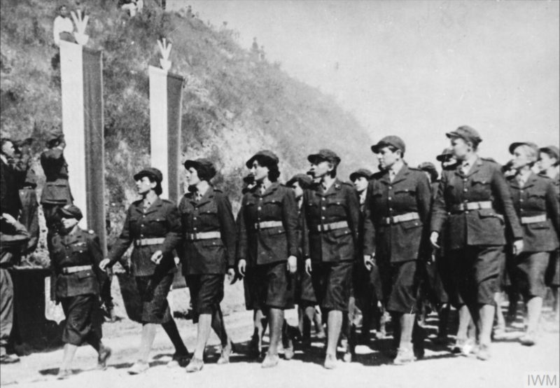 Żołnierki z Pomocniczej Służby Kobiet defilują przed gen. Zygmuntem Bohuszem-Szyszką z okazji święta Konstytucji 3 maja, obóz w Jungi-Julu w Uzbekistanie, 1942 r. (fot. ze zbiorów Imperial War Museum, sygn. MH 1726, IWM Non Commercial Licence)