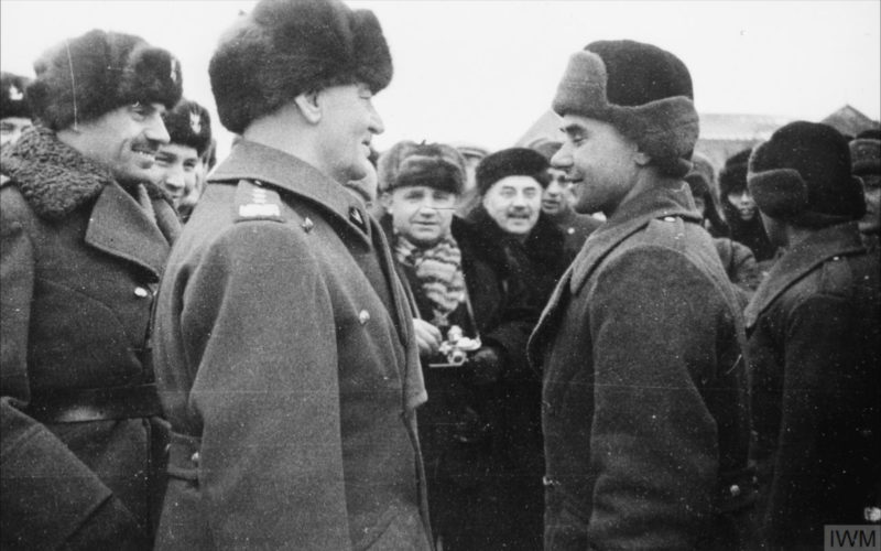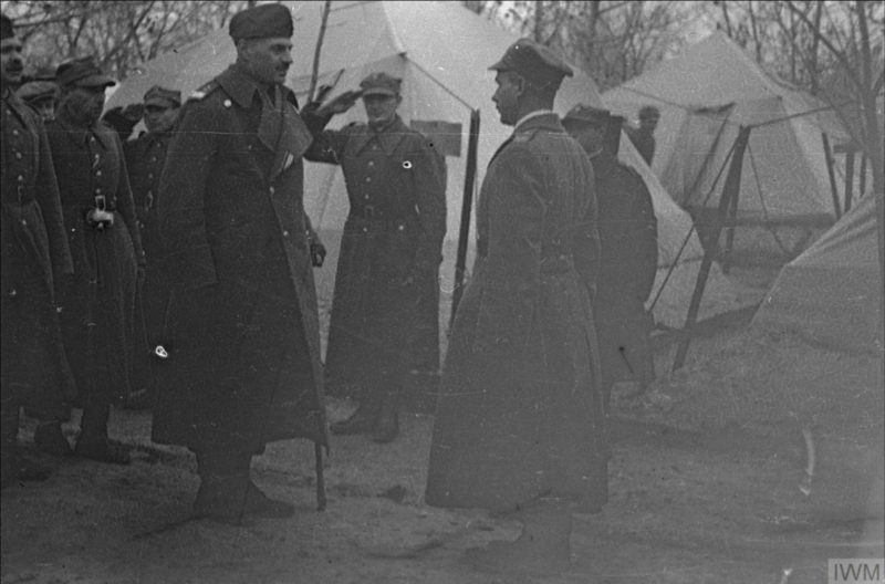Major Wiktor Stoczkowski, dowódca 2 Batalionu, 13 Pułku Piechoty 5 Dywizji Piechoty, składa raport gen. Władysławowi Andersowi, obóz w Tatiszczewie, 26 października 1941 r. (fot. Leon Tadeusz Grzywna, ze zbiorów Imperial War Museum, sygn. HU 128301, IWM Non Commercial Licence)