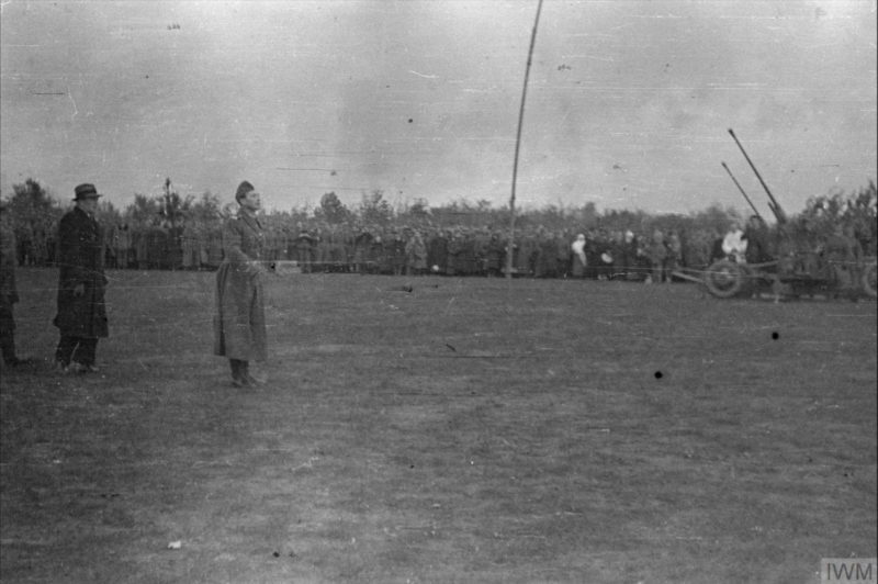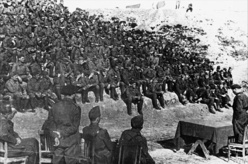 Gen. Mieczysław Boruta-Spiechowicz, dowódca 5 Dywizji Piechoty, przed mszą świętą w obozie w Tatiszczewie, 5 października 1941 r. Z tyłu za generałem, w cywilnym płaszczu, stoi szef sztabu dywizji, płk Zygmunt Berling (fot. Leon Tadeusz Grzywna, ze zbiorów Imperial War Museum, sygn. HU 128303, IWM Non Commercial Licence)