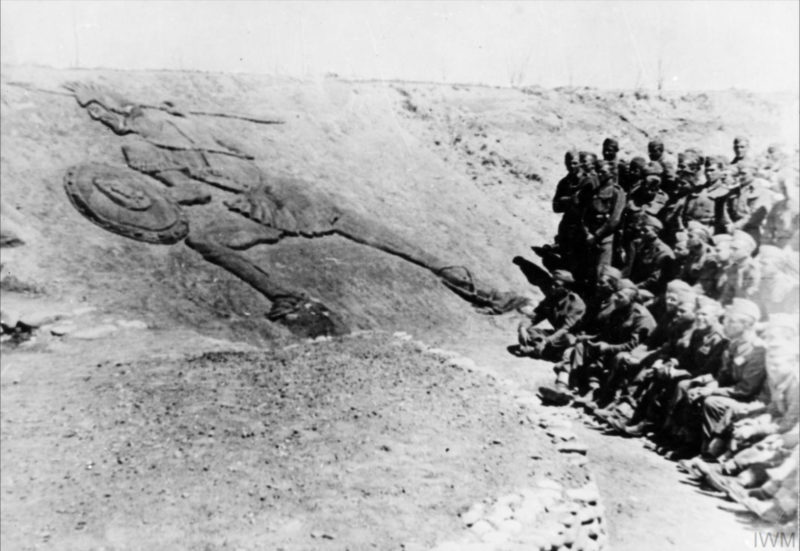 Żołnierze podziwiają wykutą w skale płaskorzeźbę greckiego hoplity z IV w, p.n.e., prawdopodobnie gdzieś w Kazachstanie, 1942 r. (fot. ze zbiorów Imperial War Museum, sygn. MH 1848, IWM Non Commercial Licence)