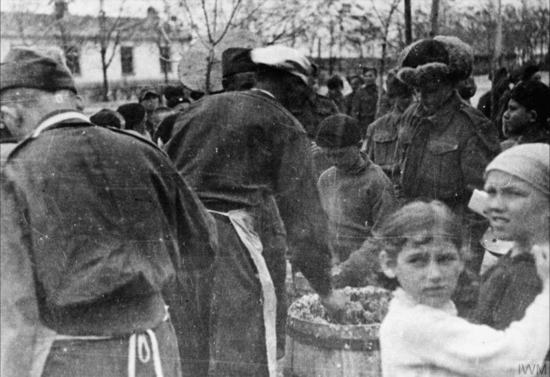 Kucharze polskiej armii wydają jedzenie żołnierzom i cywilom, prawdopodobnie obóz w Buzułuku, 1941 r. (fot. ze zbiorów Imperial War Museum, sygn. MH 1833, IWM Non Commercial Licence)
