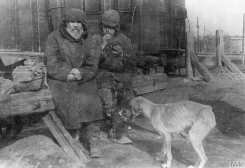 Dwaj wynędzniali mężczyźni w pobliżu stacji kolejowej, prawdopodobnie gdzieś w Kazachstanie. Deportowani z Kresów w czasie radzieckiej okupacji, po amnestii zdążali do formującej się polskiej armii, 7 lutego 1942 r. (fot. Leon Tadeusz Grzywna, ze zbiorów Imperial War Museum, syng. HU 128304, IWM Non Commercial Licence)