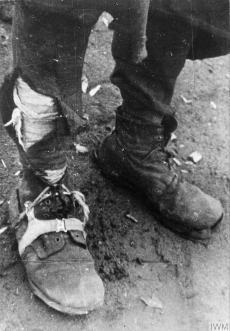 Buty więźnia gułagu zwolnionego w wyniku amnestii i czekającego na zapisanie do polskiej armii. Prawdopodobnie obóz w Buzułuku, 1941 r. (fot. ze zbiorów Imperial War Museum, sygn. MH 1844, IWM Non Commercial Licence)