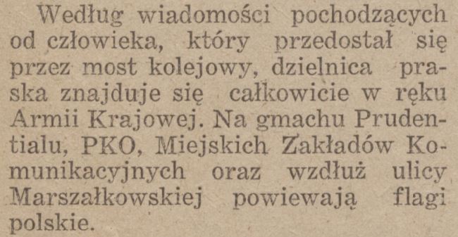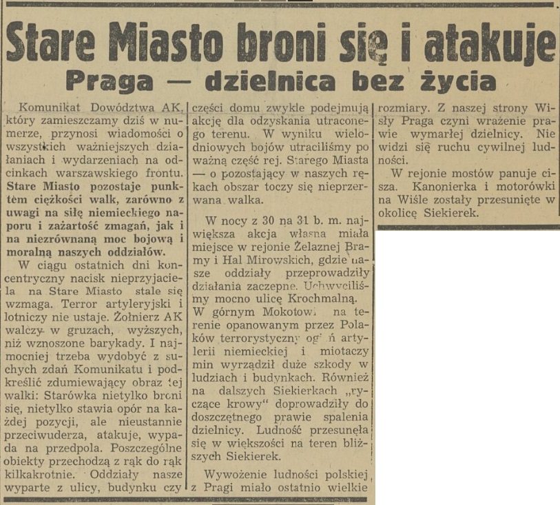 Prasa powstańcza tego okresu również nie pozwalała na wyrobienie sobie stanowczego i jednoznacznego poglądu na wydarzenia na Pradze. „Biuletyn Informacyjny” z 2 sierpnia pisał o odcięciu Pragi od Warszawy i związanym z tym brakiem wiadomości, choć dzień później „Robotnik” podawał, iż „dzielnica praska znajduje się całkowicie w ręku Armii Krajowej”. 5 sierpnia sam „Biuletyn” poinformował czytelników, że „Na Pradze położenie dobre”.