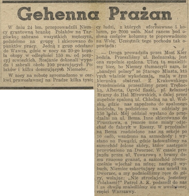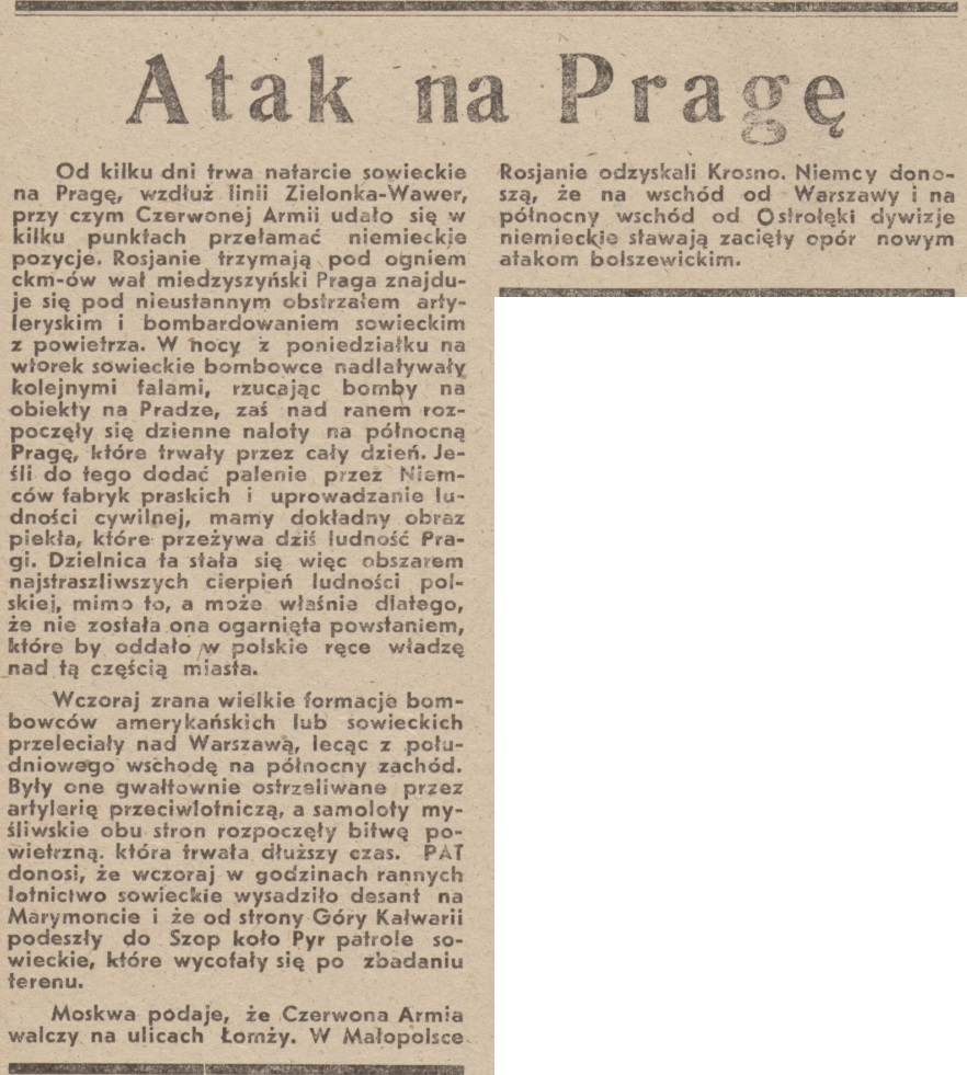 Dopiero 14 sierpnia „Dzień Warszawy” napisał: „Na Pradze panują Niemcy. Oddziały A.K. przedarły się poza miasto lub ukrywają się”. Następnego dnia potwierdził to „Biuletyn” i inne czasopisma. Mimo przerwania działań w tej dzielnicy Praga nadal gościła na łamach wielu gazet, choć bardziej w kontekście sytuacji ludności cywilnej czy też zbliżania się Armii Czerwonej.