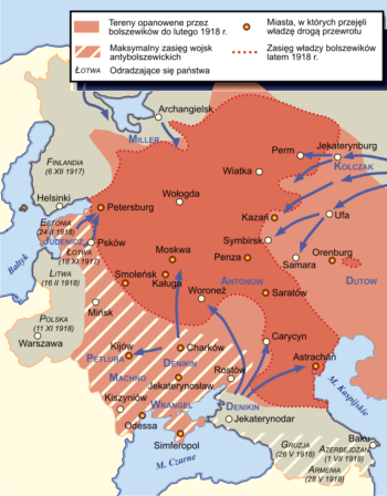 Jedynie w większych miastach i miasteczkach stały bolszewickie garnizony, które usiłowały wprowadzać nowe porządki, a póki co rozbrajały wracających z frontu żołnierzy i oficerów, niektórych aresztując lub zabijając. „Mordy, pożogi, rujnowanie mostów i torów kolejowych były to zjawiska codzienne” – pisał Henryk Bagiński.