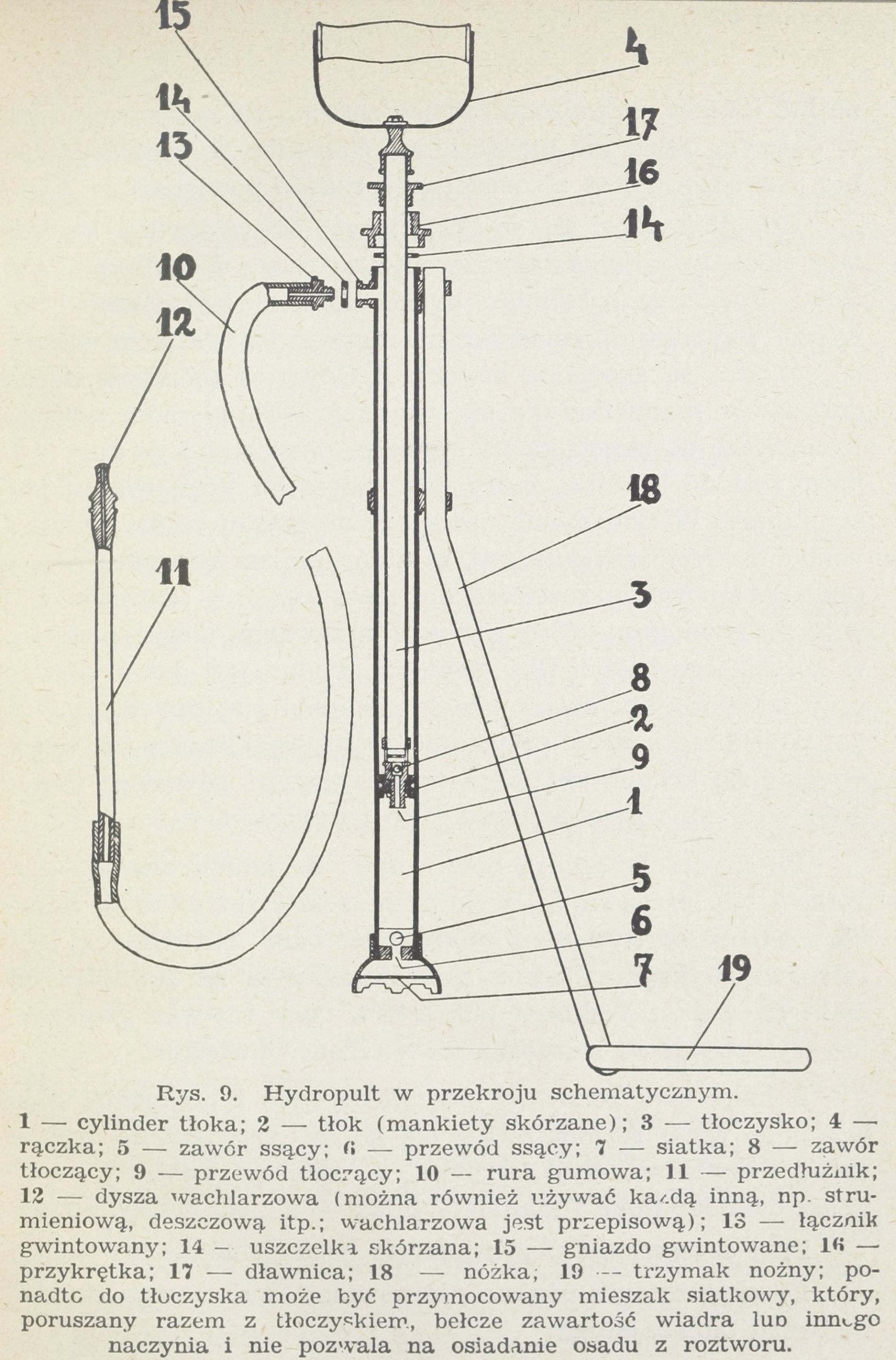 Szkolenie drużyny odkażającej obejmowało również naukę poprawnego obsługiwania hydropulta, czyli niewielkiej ręcznej pompki pozwalającej na rozpylanie cieczy zaczerpniętej z wiadra. Wbrew pozorom, to niepozorne i nieskomplikowane urządzenie mogło oddać nieocenione usługi przy szybkim oczyszczaniu ulic czy podwórzy. Cytując: „Hydropult używa się w ten sposób, że wstawia się go do wiadra, pozostawiając trzymak nożny na zewnątrz i przyciskając go nogą, a następnie jedną ręką uruchamia się tłok, a drugą trzyma przedłużnik i rozpryskuje roztwór lub wodę”.