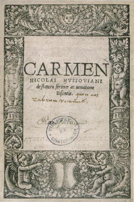 - Mikołaj Hussowski, Pieśń o żubrze, [w:] Tradycja – Kultura – Literatura, [dostęp: 18 maja 2020] <http://staropolska.pl/renesans/wczesny_humanizm/Mikolaj_Hussowski.html> [cyt. za: Najstarsza poezja polsko-łacińska, oprac. Marian Plezia, Warszawa 1952].