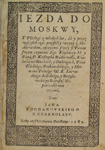 - Jan Kochanowski, Iezda do Moskwy y posługi z młodych lat aż y przez wszystek czas przeszłey woyny z Moskiewskim oyczyznie swey y panom swym czynione…, Drukarnia Łazarzowa, Kraków 1583.