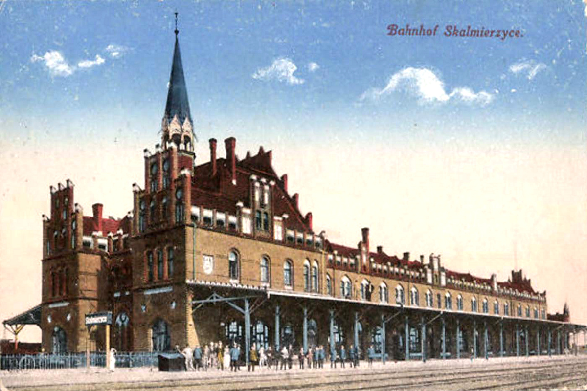 Kalisz i Ostrów są, jak wiadomo, miastami zbliżonej wielkości, co powoduje ich naturalną rywalizację. Podobnie było i w XIX stuleciu, gdy rozdzielał je kordon graniczny. Chcąc jakby pogodzić oba te ośrodki, zdecydowano, że stacja graniczna nie powstanie ani w jednym, ani w drugim z tych miast, lecz pomiędzy nimi, tuż za samą granicą. Padło na położone po niemieckiej stronie Skalmierzyce. Podobnie jak w Maczkach, a później w Aleksandrowie, i tam zbudowano okazały dworzec, godny dużej metropolii, a nie małej wioski (choć z czasem Nowe Skalmierzyce stały się niewielkim miastem).