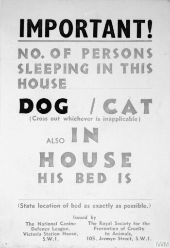 Oficjalną i urzędową wskazówką dla wszystkich posiadaczy psów i kotów (acz nie tylko) stała się broszura „Air Raid Precautions for Animals”, licząca sobie skromne 29 stron. Jej lwią część zajmuje opis obrażeń, jakie może wywołać u zwierząt użycie bomb burzących, zapalających i gazowych. Na jej końcu znajdziemy również opis niewielkiego urządzenia służącego do szybkiego uśmiercania dużych rannych zwierząt, takich jak konie, krowy czy owce.