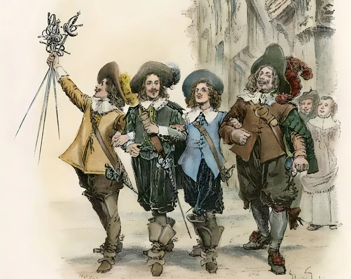 W Paryżu d’Artagnan spotkał prawdopodobnie wielu podobnych mu młodych ludzi – „kadetów z Gaskonii”, których mógł znać jeszcze z rodzinnych stron. U Dumasa d’Artagnan dzieli swoje przygody z trzema, bardziej doświadczonymi w wojskowym fachu, muszkieterami. Ci prawdziwi pochodzili z prowincji Béarn. Książkowy Atos jest najstarszy spośród grupy przyjaciół i skrywał tożsamość hrabiego de la Fère. Ten prawdziwy nazywał się Armand de Sillègue d’Athos d’Auteville i był krewnym kapitana de Troisville. Urodził się między 1615 a 1620 rokiem i zmarł w 1643. Portos, sportretowany przez Dumasa jako korzystający z uroków życia baron de Vallon, w realnym życiu nazywał się Isaac de Portau i pochodził z zamożnej hugenockiej rodziny. Urodził się w 1617 roku. Prawdopodobnie kilka lat po wstąpieniu do muszkieterów został ranny i zrezygnował ze służby. Miał potem wyjechać do Gaskonii i pracować jako strażnik amunicji w cytadeli Navarrenx. Aramis z powieści pragnął zostać księdzem, a zawód muszkietera był dla niego tylko tymczasowy. Urodzony około 1620 roku Henri d’Aramitz (lub Aramits) również był krewnym kapitana muszkieterów, który przyjął go do służby na początku lat 40. Po dekadzie, gdy kardynał Mazarin rozwiązał muszkieterów, wrócił w rodzinne strony, ożenił się i miał trójkę dzieci. Zmarł na początku lat 80. XVII wieku.