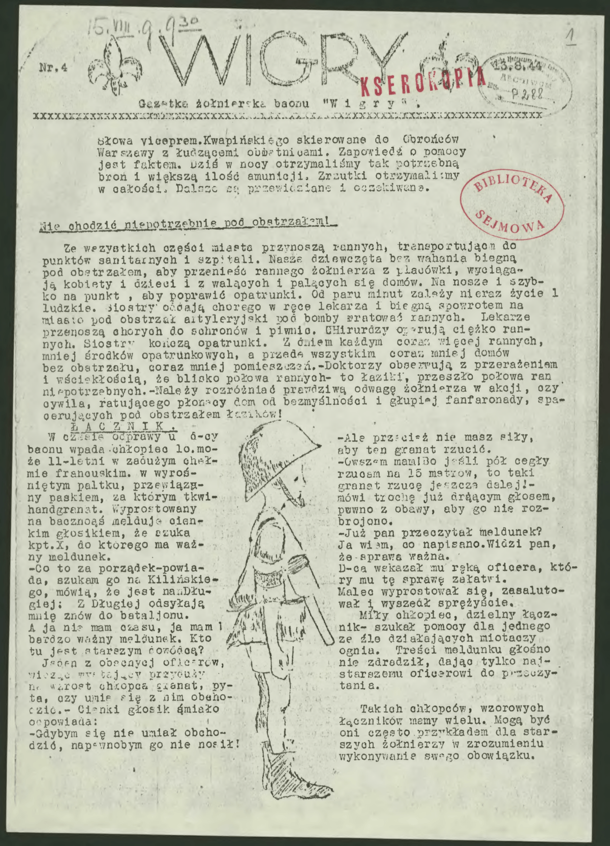 Powyższe akapity zawierają wzmianki o kilku tytułach, niemniej daleko im do przeglądu całości prasy ilustrowanej wydawanej w czasie powstania. Materiały graficzne (choćby pojedyncze) znajdujemy na przykład w piśmie „Dzieci Mokotowa” (zachował się tylko jeden egzemplarz!), „Dzienniku Radiowym AK XXII Obwodu” czy „Wigrach” – i całkiem możliwe, że w swej kwerendzie pominąłem ten czy inny numer ilustrowany czasopisma zazwyczaj pozbawionego jakichkolwiek ozdób graficznych. Nigdy nie dowiemy się też, ile egzemplarzy ilustrowanych gazet czy jednodniówek przepadło na zawsze w wojennej zawierusze. Być może są jeszcze gdzieś pochowane, w jakiś skrytkach czekających na remont mieszkania czy zwykły łut szczęścia…