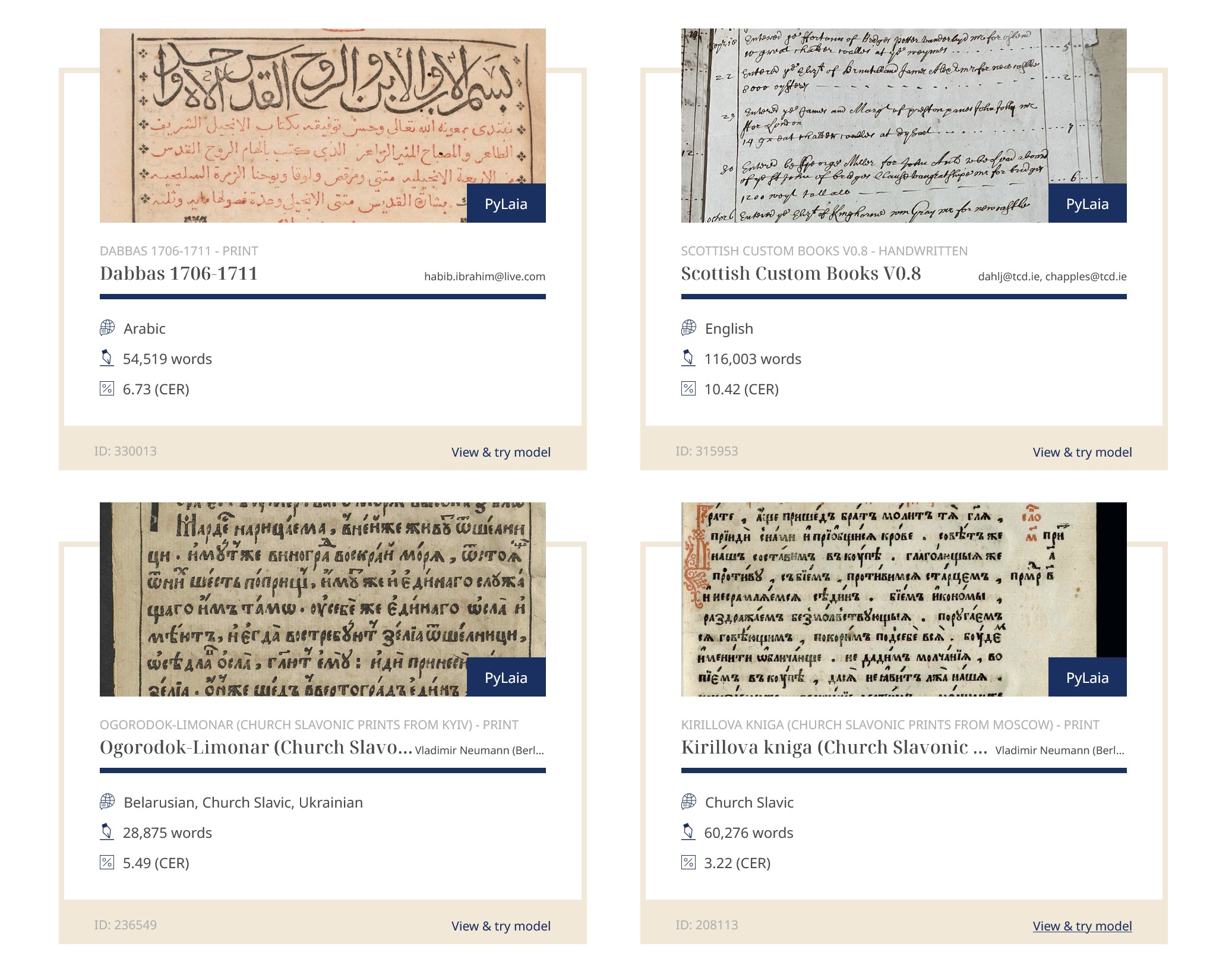 Na platformie Transkribus dostępnych jest publicznie i za darmo ponad 250 z ogólnej puli ponad 20 tys. modeli do odczytywania pisma ręcznego, które wytrenowano do tej pory w ramach poszczególnych projektów. Są wśród nich modele do odczytywania ksiąg liturgicznych i teologicznych drukowanych w Kijowie w XVIII wieku, modele trenowane na tekstach z biskupiego skryptorium z Wormacji z XI wieku czy ułatwiające rozczytanie listów wysyłanych przez żołnierzy z Finlandii z frontów II wojny światowej. W katalogu dostępnych publicznie modeli znajdziemy także taki przeznaczony do języka polskiego oraz modele do rozpoznawania tekstów w jydisz, sanskrycie czy języku łacińsko-jawajskim.